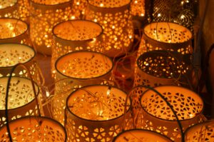 Vergeet die perfecte Pinterest-lampionnen. Pak een lege melkpak of yoghurtbeker, prik er gaatjes in en stop er een led-lichtje of zaklamp in. Geen touwtje? Een schoenveter, cadeaulint of groot haarelastiek werkt prima.